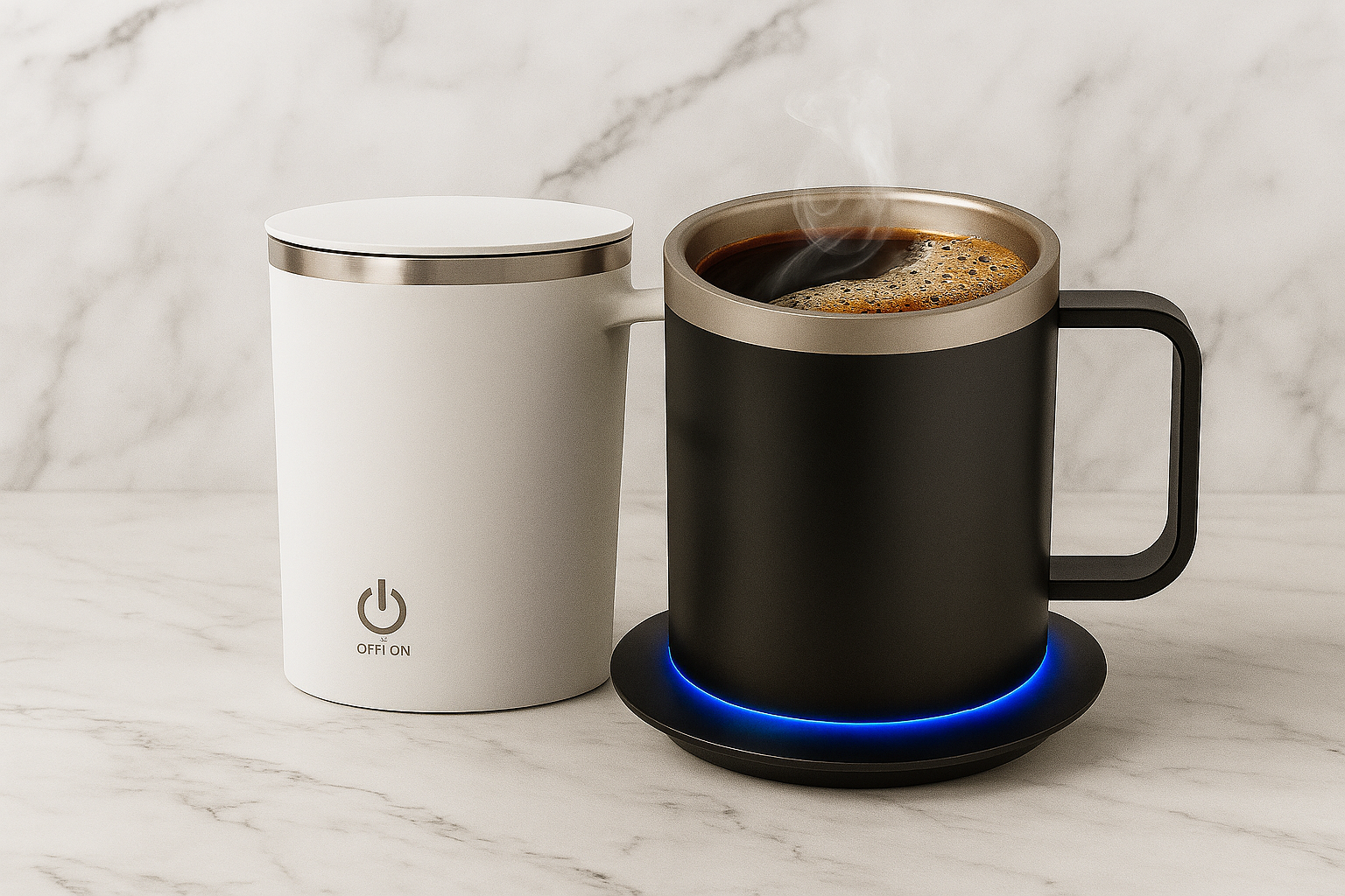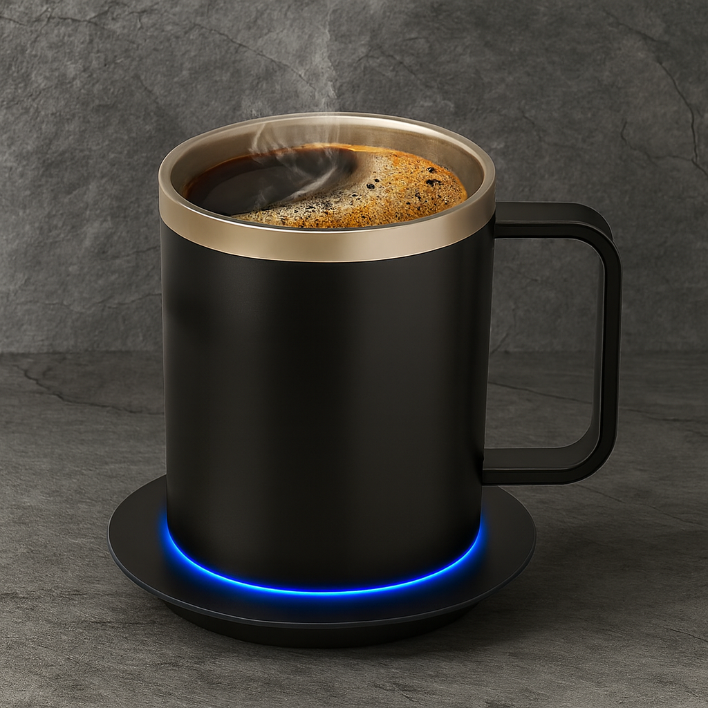 Self heating mug, temperature-controlled mug designed for coffee, tea, hot cocoa, and other everyday beverages.
